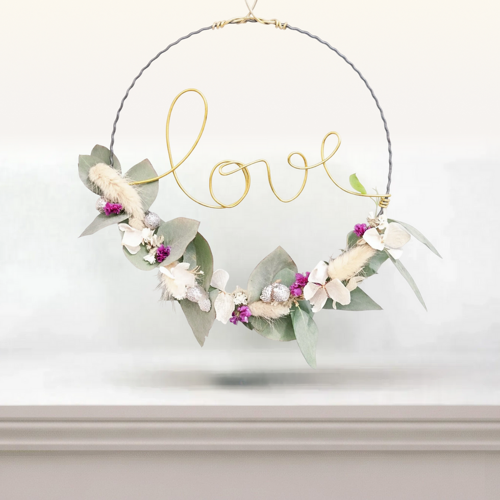 Couronne fleurs séchées et stabilisées, motif doré "Love".
